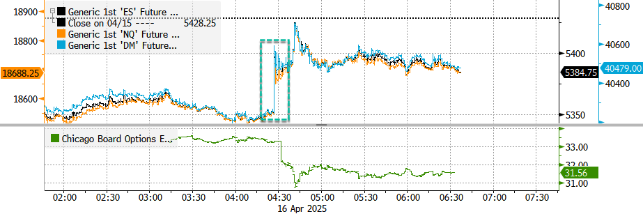 Nasdaq 100 and S&P 500 e-mini futures trimmed overnight losses after China reportedly laid out a set of preconditions for resuming trade talks with President Trump and his administration, https://www.bloomberg.com/news/articles/2025-04-16/china-open-to-talks-if-trump-shows-respect-names-point-person