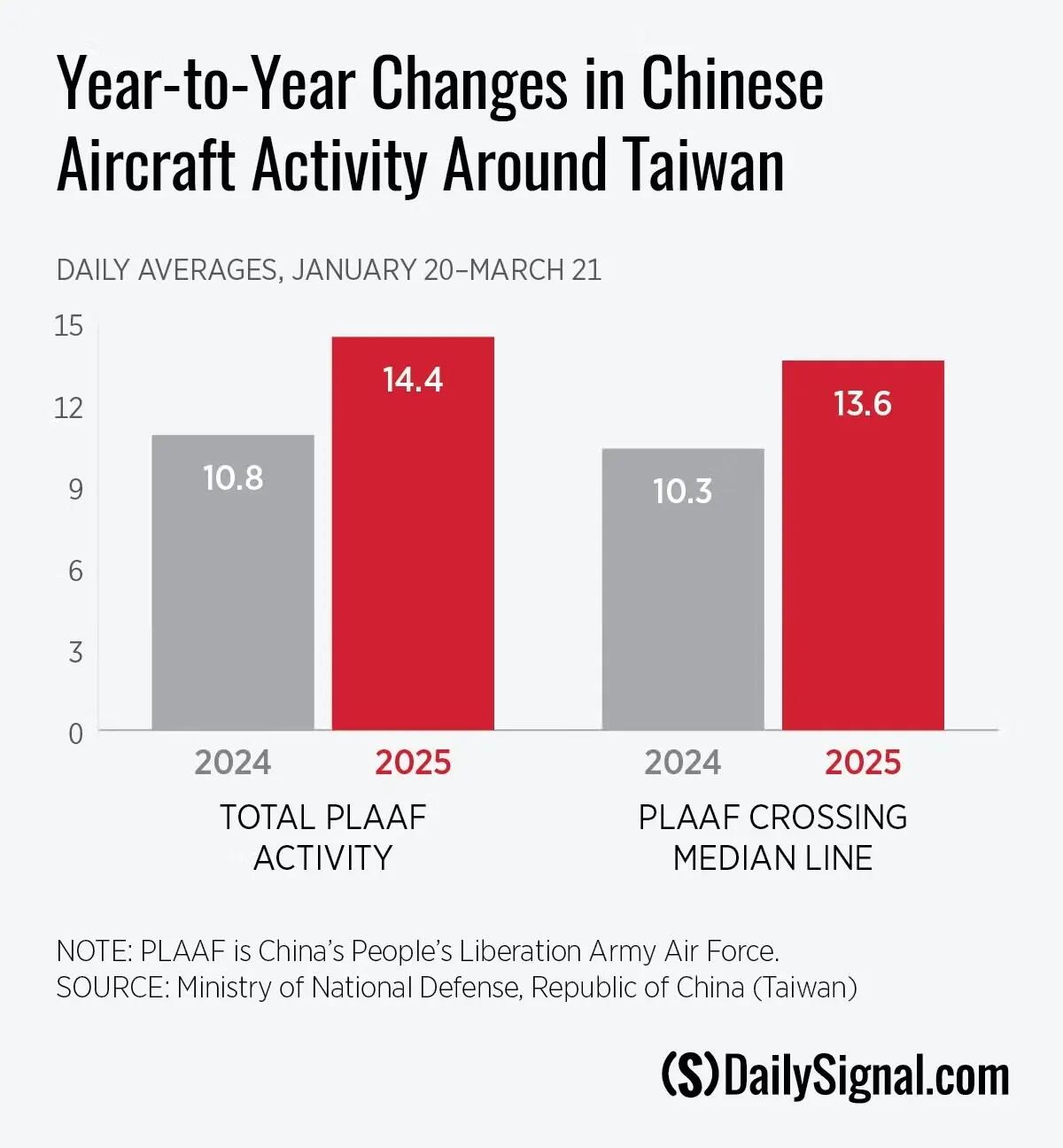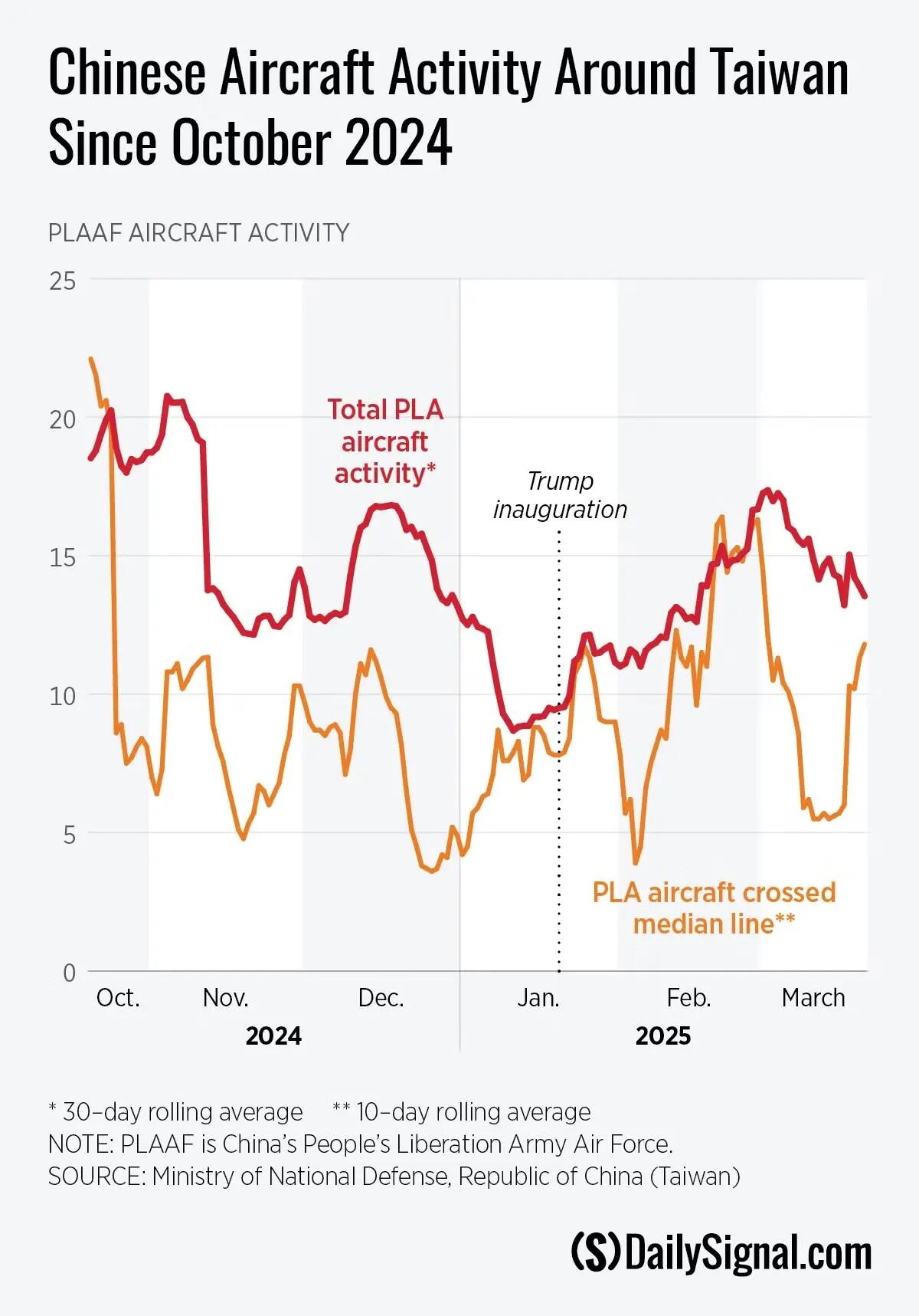 By mid-March, the 10-day average of median line crossings by Chinese aircraft showed a significant rise, almost doubling from six on March 17 to 11.8 by March 21—largely attributable to one day’s spike in activity on March 18.