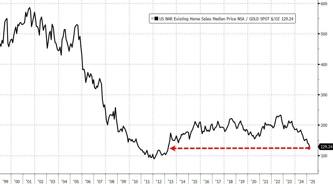 Finally, while home prices are at record highs, on a 'real' inflation adjusted basis (relative to gold, we mean), they are at 12 year lows...