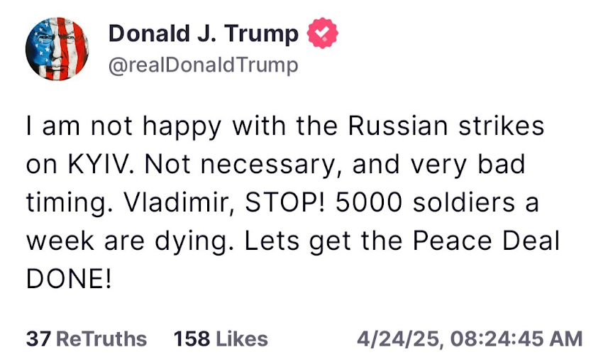 "I am not happy with the Russian strikes on KYIV," Trump posted https://truthsocial.com/@realDonaldTrump/