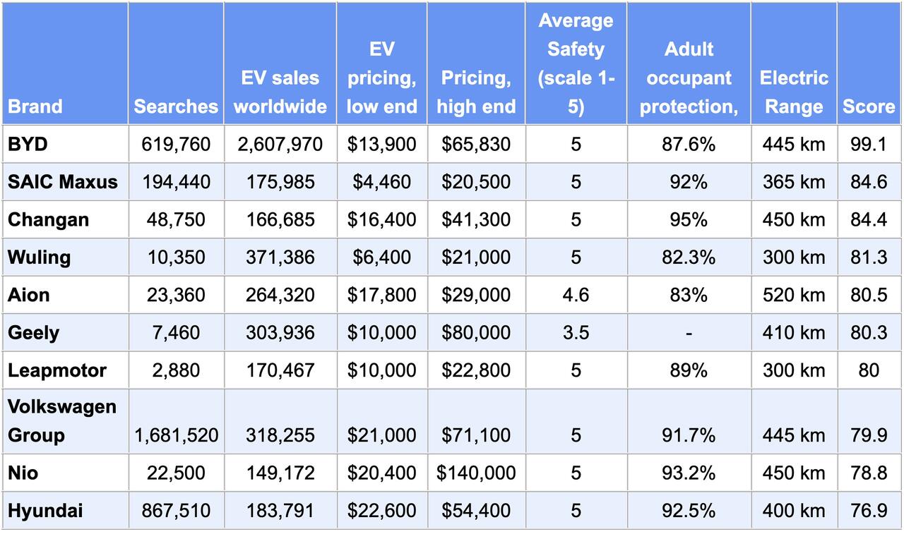 says that Changan, in third, makes its mark with a stellar 95% adult occupant protection rating and a 450 km range. While not yet globally synonymous with electric innovation, its performance metrics suggest it soon might be. The Deepal SL03 has particularly impressed in the mid-price market, starting around $16,400.