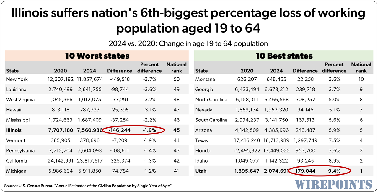 Nation’s 6th-worst drop in working-age residents. Illinois needs a massive growth in its tax base to change its current trajectory from ever-higher taxes to actual tax relief. Not to mention it needs more productive workers to spread out the cost of its nation’s-highest pension debt.