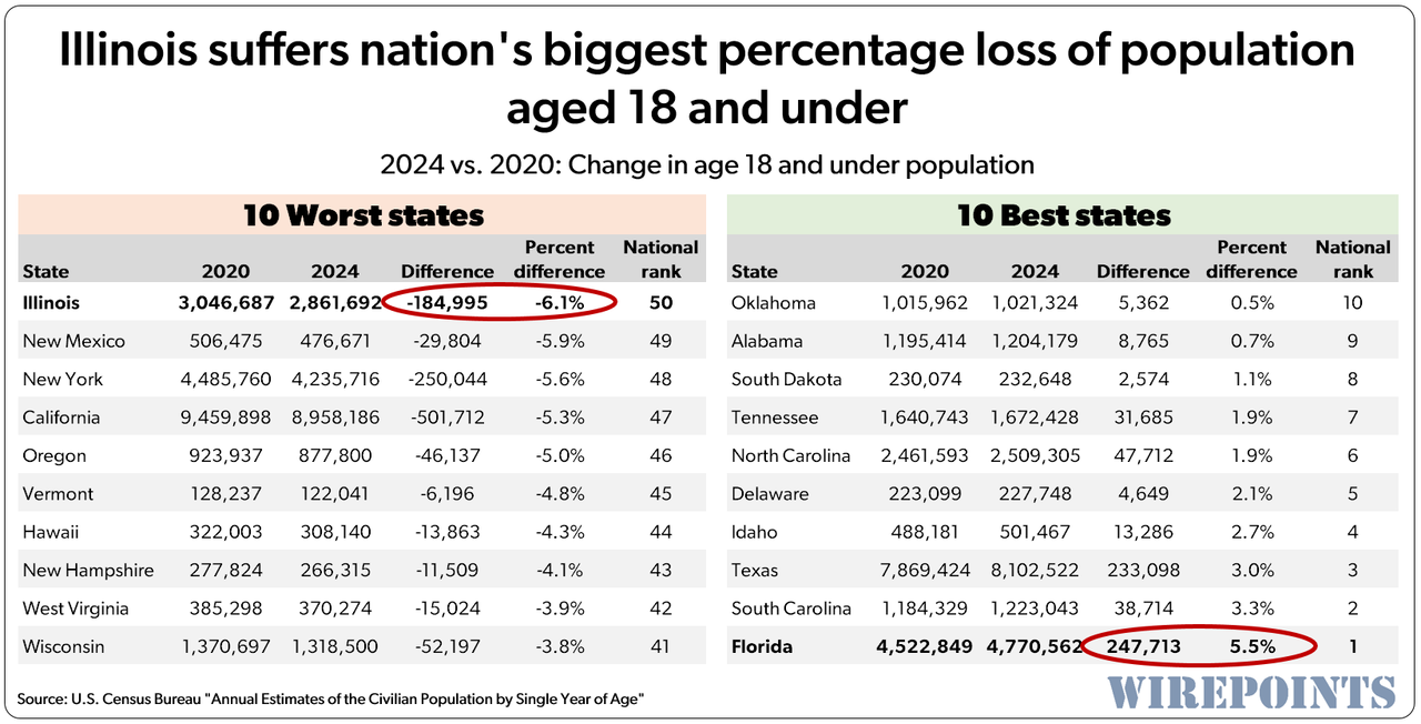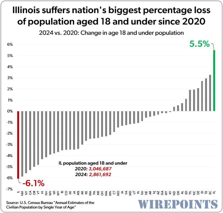Nation’s worst drop in number of residents age 18 and under. Illinois had 184,000 fewer residents aged 18 and under in 2024 vs 2020. That’s a 6% drop, the biggest percentage loss in the country.