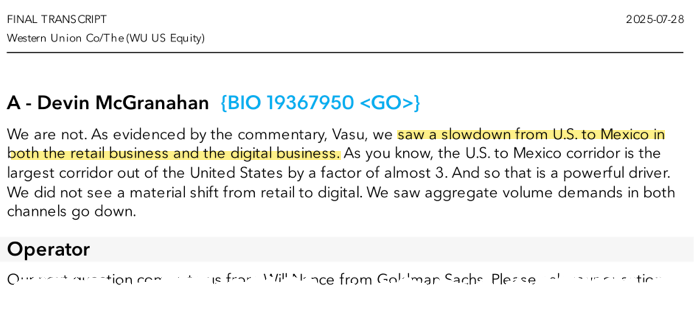 CEO Devin McGranahan explained that the "slowdown" is in both retail and digital businesses between the United States and Mexico.