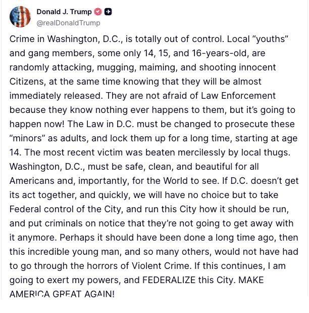 The president also posted a lengthy message on Truth Social about the deteriorating crime situation in the nation's capital. He said the city is "totally out of control," adding that kids as young as 14, 15, and 16 are randomly attacking, mugging, maiming, and shooting innocent citizens.