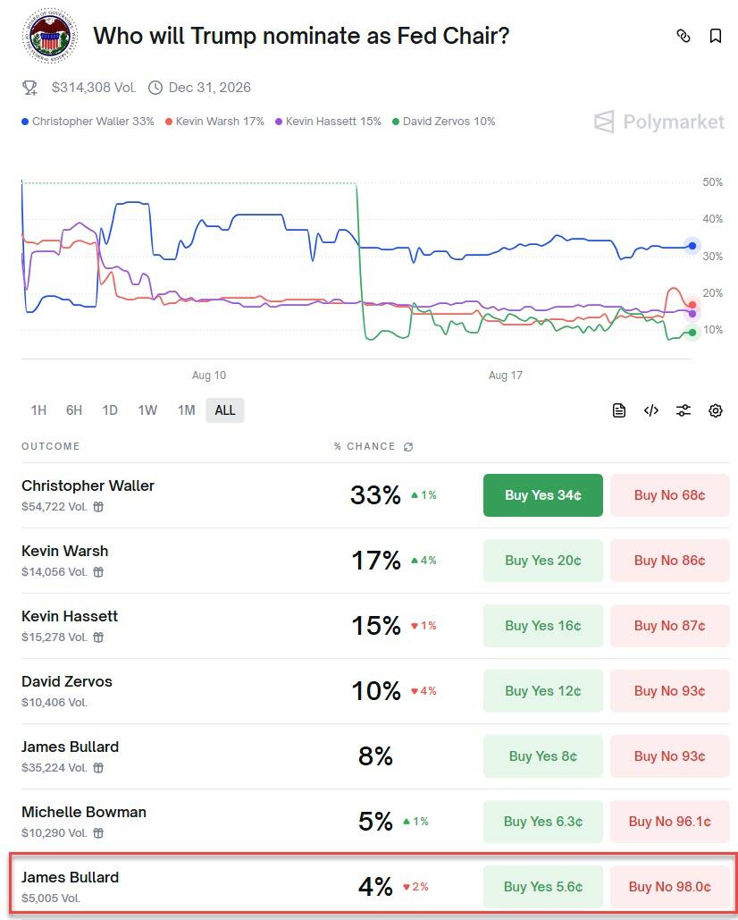 Unfortunately for Bullard, he remains dead last in the https://polymarket.com/event/who-will-trump-nominate-as-fed-chair?tid=1755783705885