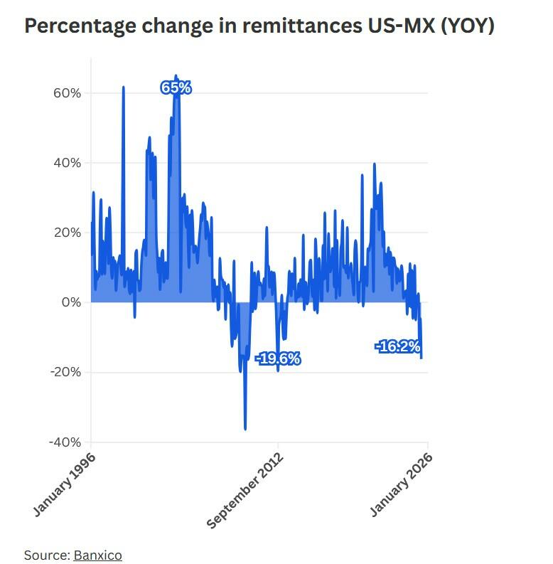 Over the past year, nearly $63 billion was sent back to Mexico by people living north of the border - a significant drop from the peak years of 2023 and 2024.