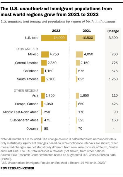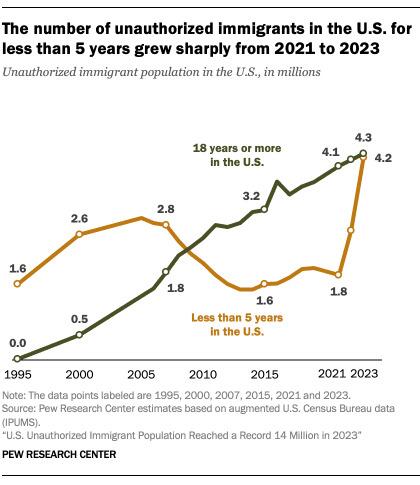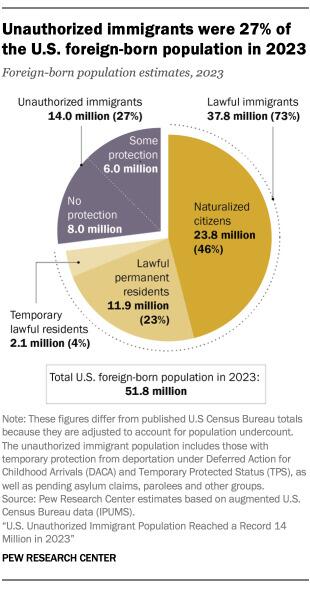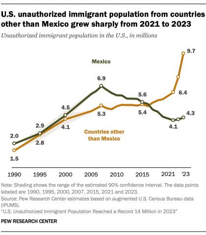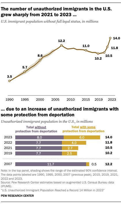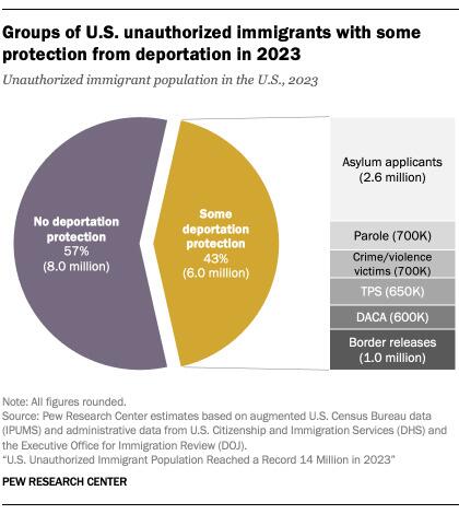 There are about 6 million unauthorized immigrants with some degree of protection as of July 2023. The groups with temporary protection from deportation described above total just over 6.2 million individuals. However, some individuals can appear in more than one category. For example, some paroled into the U.S. (say, OAW Afghans) may also acquire another status like TPS. While exact overlap is not known, most newly arrived groups likely do not appear in multiple categories. We estimate about 250,000 migrants are counted more than once. This leaves a total of about 6 million unauthorized immigrants with some degree of protection from deportation.