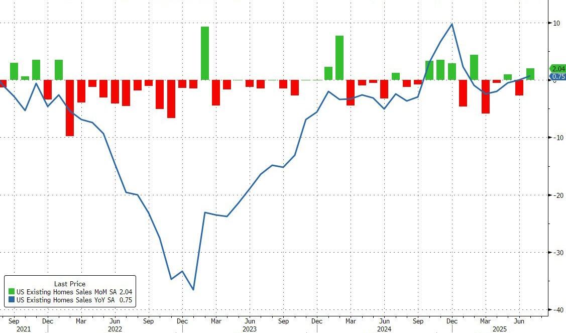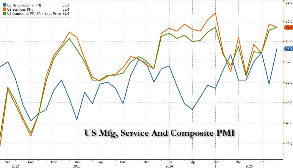 At the same time the S&P Services PMI declined from last month's red hot 55.7 to 55.4, but still beat estimates of 54.2. As a result, the composite PMI of US business activity grew at the fastest rate recorded so far this year in August, rising to 55.4 from 55.1, matching the previous post-covid high from Dec 2024 and adding to signs of a strong third quarter. Output has now grown continually for 31 months, with the latest two months seeing the strongest back-to-back expansions since the spring of 2022.