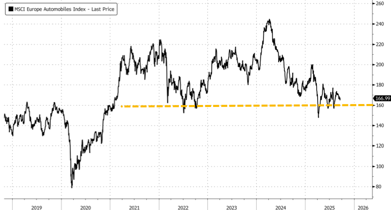 Industry-wide across the continent, the MSCI Europe Autos Index is down 6% year-to-date, hovering on a fine line of support around 160 euros.