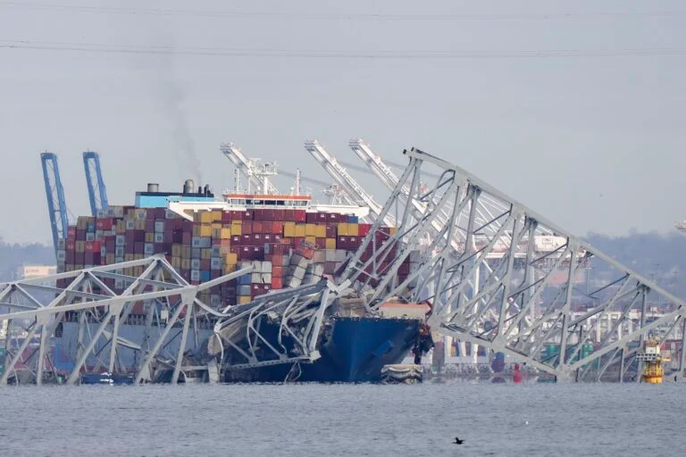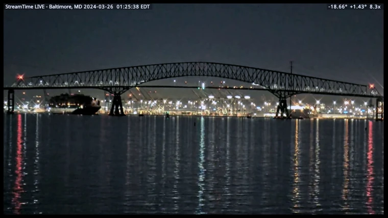 今天凌晨1:30,一艘幾乎1000英尺長的丹麥集裝箱貨輪,過橋以前,出現電力不穩,然後就偏離航線,直接撞上一個橋墩,摧枯拉朽地把整個1.6英里長的橋給拉垮了。