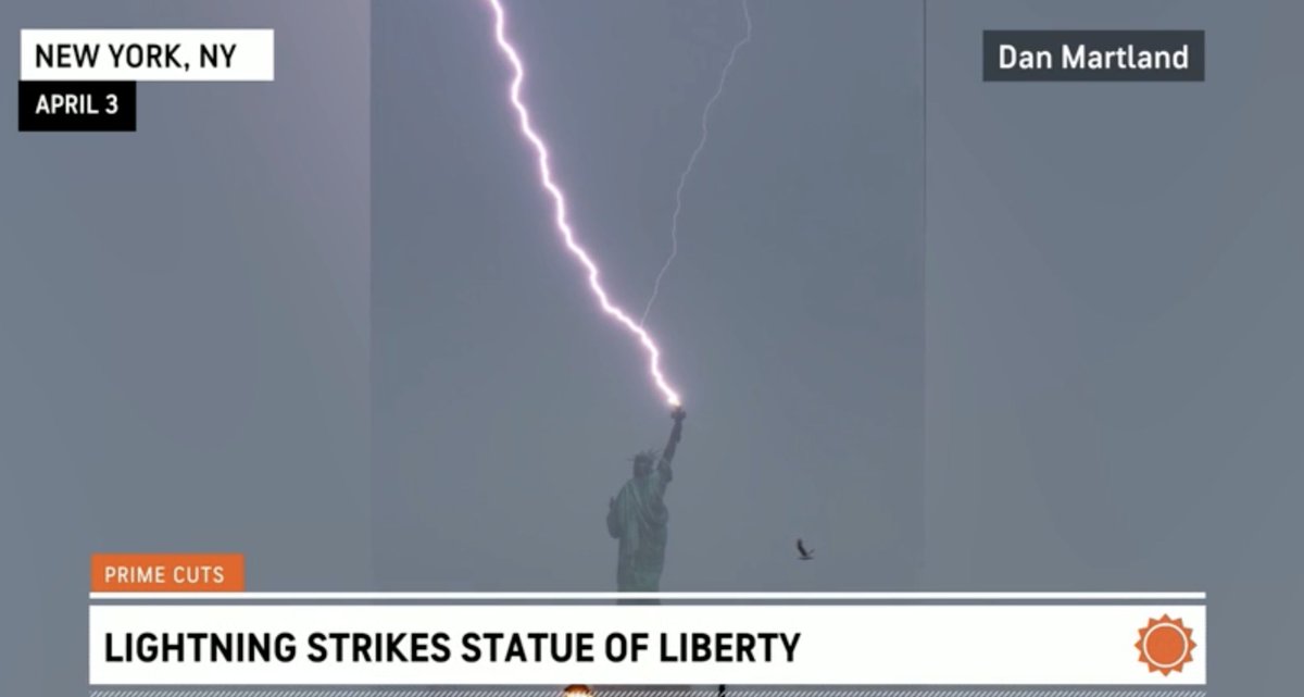 星期三晚上,纽约自由女神像被两股闪电打到,直接打到火炬上。