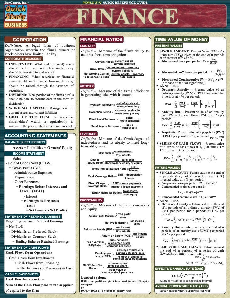 这张图是关于金融的快速参考指南,涵盖了多个重要的金融概念和公式,包括公司结构、会计报表、财务比率、时间价值等。以下是每个部分的详细内容: