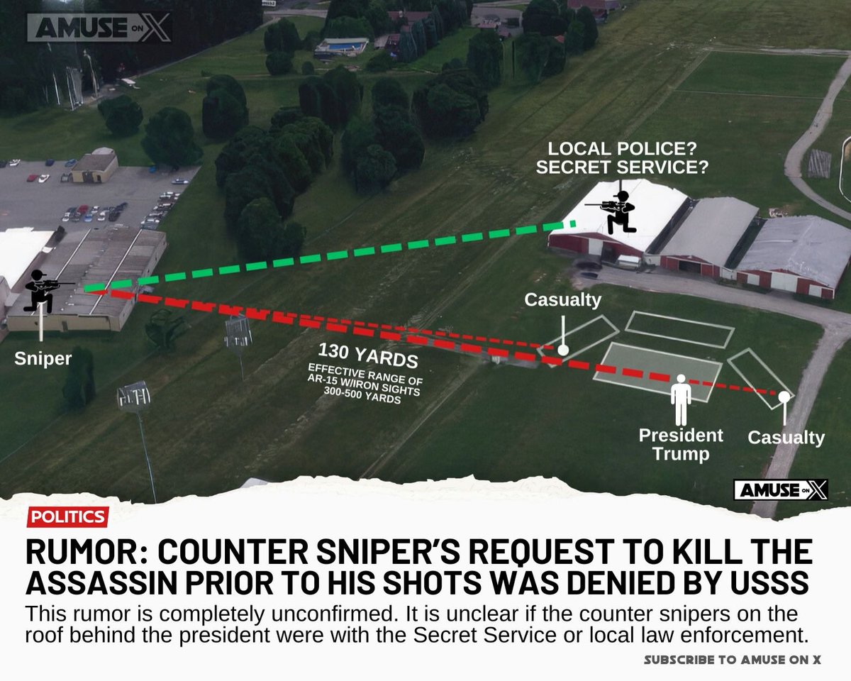 5. Local Police? Secret Service?(当地警察?特勤局?):在特朗普附近的建筑物顶部,有两个人形标注,表示不确定他们是当地警察还是特勤局的成员。他们的位置显示了他们在事件发生时可能的反应区域。