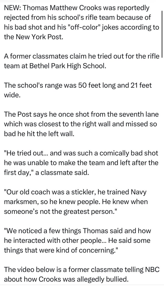 Thomas Matthew Crooks在Bethel Park高中尝试加入校射击队,但因射击技术差和“粗俗”笑话被拒。根据《纽约邮报》报道,Crooks在尝试中曾从第七条射击道射击,位置靠近右墙,但却射偏击中了左墙,显示出其射击技能非常糟糕。