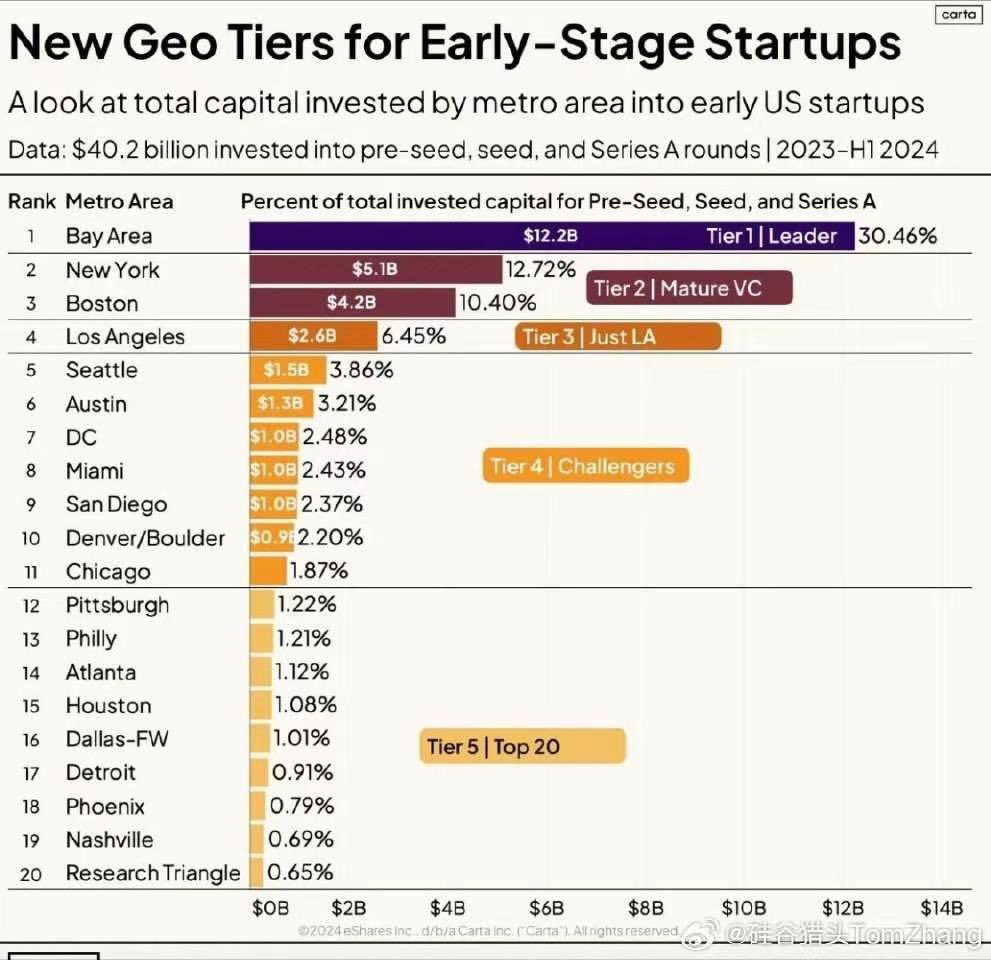 根据获得种子轮到A轮的投资金额来划分,美国的早期投资可以划分为 5 个梯队:硅谷是第一;纽约/波士顿第二;洛杉矶第三;西雅图/奥斯汀/DC/迈阿密/圣地亚哥/丹佛/芝加哥第四;费城/达拉斯等第五。 https://t.co/KRfUJHzh99