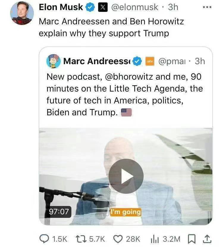 硅谷大变天,民主党的长期支持者, 一直是标杆的A16Z的两位创始合伙人Marc和Ben公开表态并花了90分钟解释为什么他们要支持Trump。 上午刚刚看到新闻说A16Z可能要倒戈。 https://t.co/7A4YGYD6AS