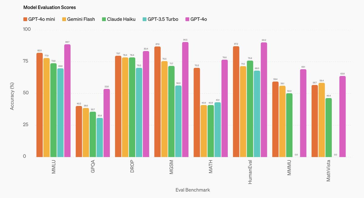 - 多模态推理:GPT-4o mini在MMMU(多模态推理评估)中的表现也很强,得分为59.4%,相比之下Gemini Flash得分56.1%,Claude Haiku得分50.2%。
