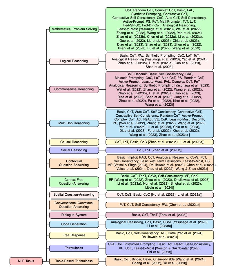 这张图展示了各种自然语言处理(NLP)任务,以及在这些任务中各种技术和方法的应用。每个任务都有不同的颜色标注,看起来像是一个多彩的任务树。