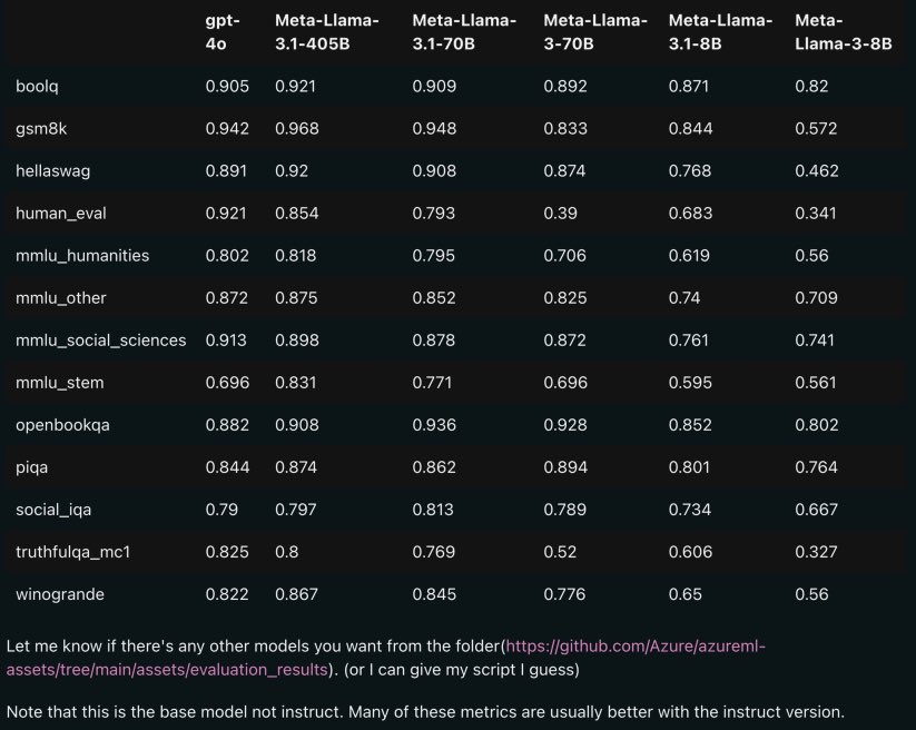 - Meta-Llama-3.1-405B 在大多数基准测试中表现最佳,是目前最强的模型之一。