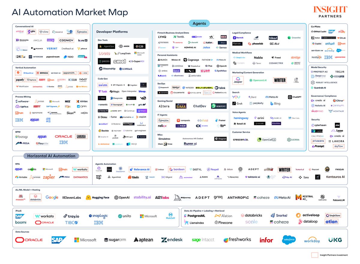 这张图展示了AI自动化市场的整体布局,涵盖了不同领域的AI工具和平台。为了便于理解,下面用大白话详细解读这张图,并举例两个具体应用场景。
