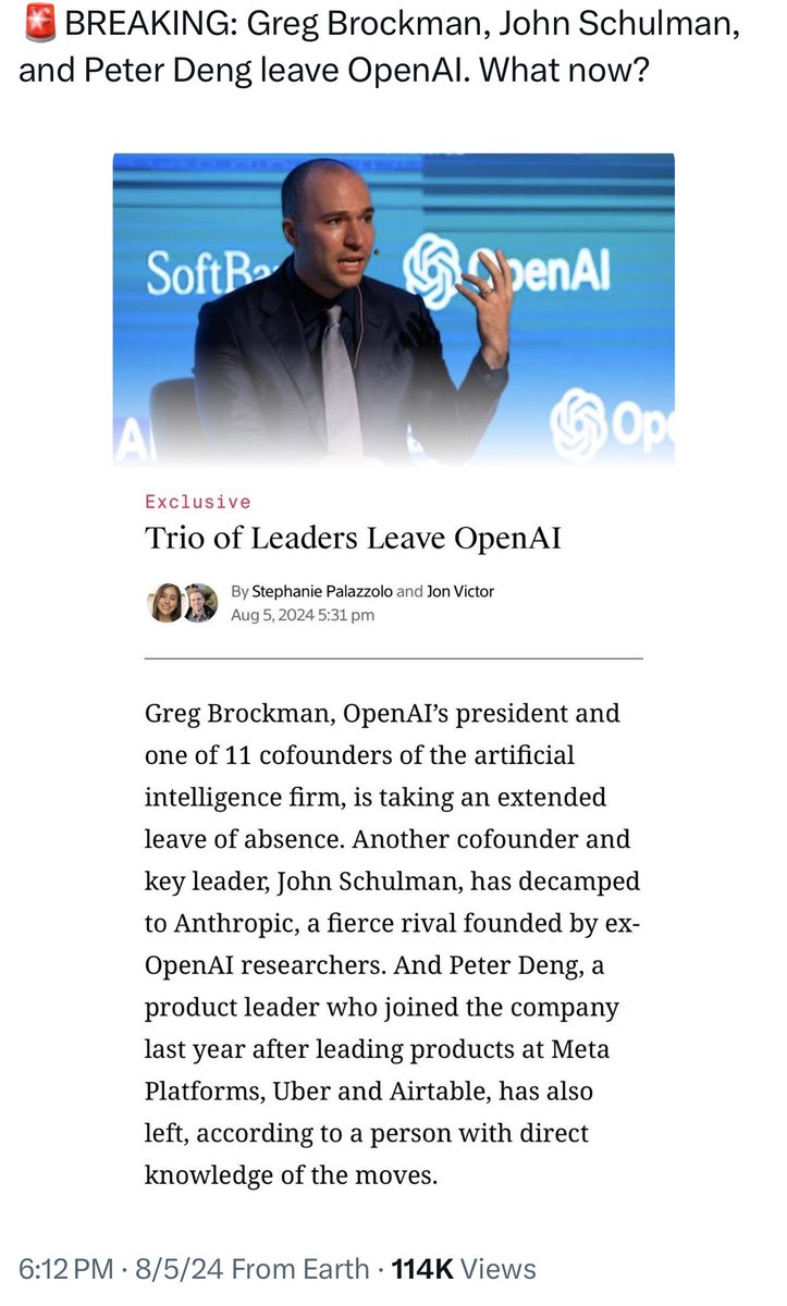 据https://t.co/St5O59mmxt分析,OpenAI近日经历了重大人事变动,三位核心高管的离职或休假引起了广泛关注。这三位高管分别是Greg Brockman、John Schulman和Peter Deng。他们的离职或休假引发了对OpenAI内部动荡和未来发展方向的诸多猜测。