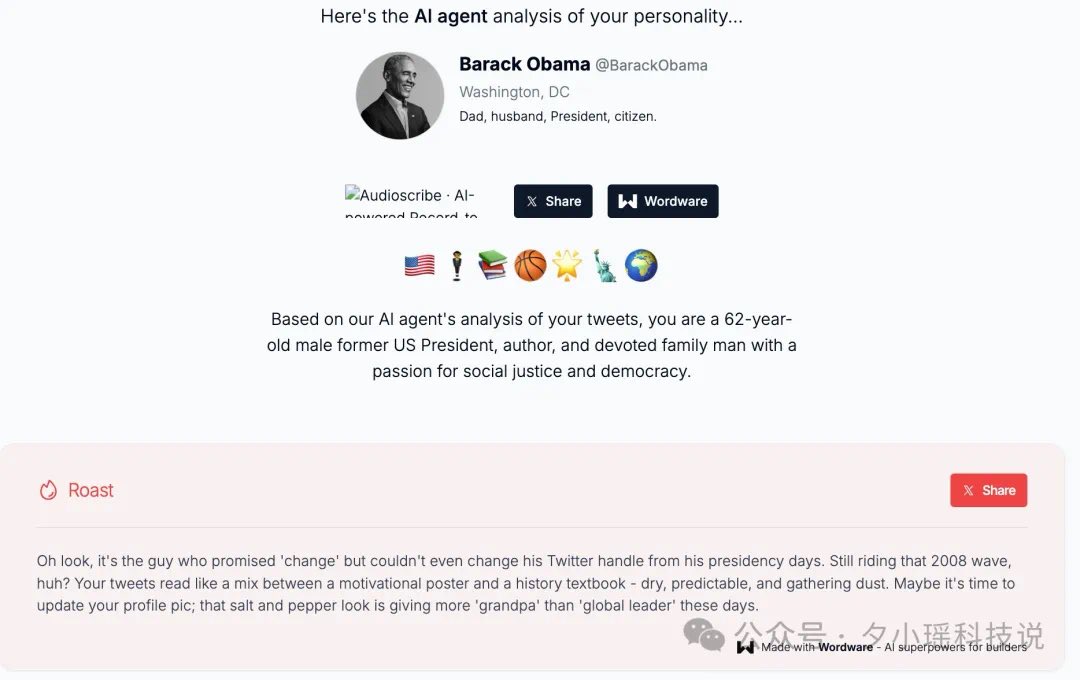 - AI评论:“承诺变革,却连总统任期内的推特账号都改不了的家伙。你的推文读起来像励志海报和历史教科书的混合体——枯燥、可预见、积满灰尘。”