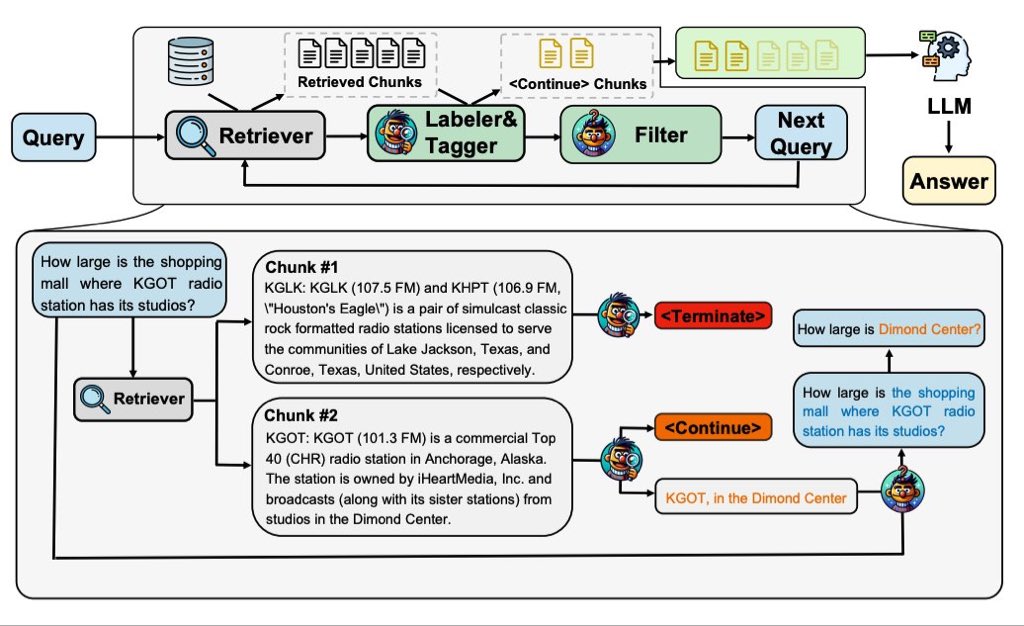 2. 迭代过滤模型:该模型根据原始问题和先前的注释来制定下一步查询。这个过程会不断迭代,直到所有的数据块被标记为终止,或达到最大迭代次数。