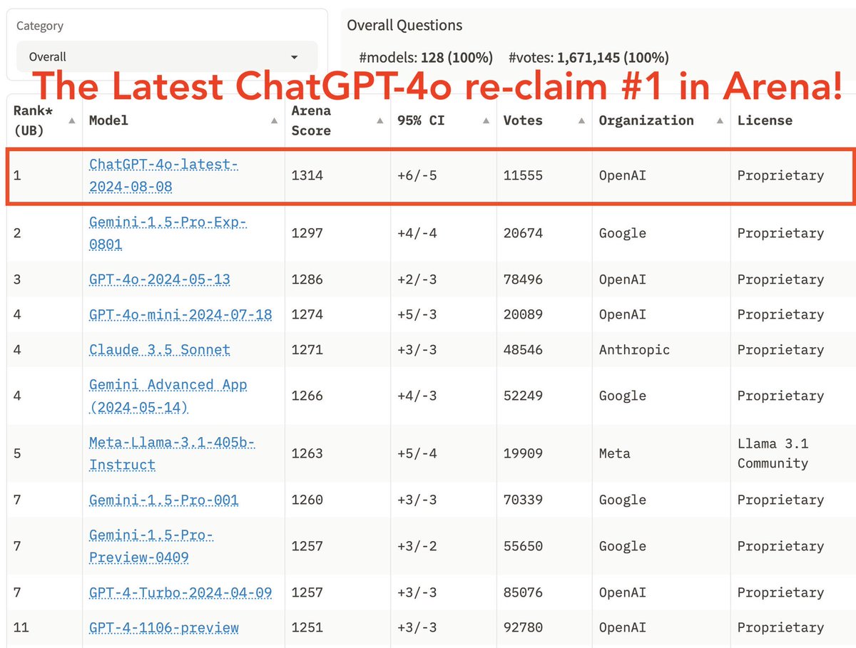 最新的OpenAI ChatGPT-4o(20240808版本)在过去一周内通过"anonymous-chatbot"进行了测试,并且获得了超过11,000次社区投票。