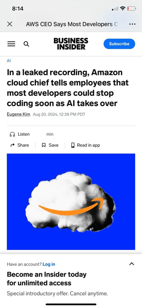 一篇来自Business Insider的新闻文章,标题为“在一段泄露的录音中,Amazon云计算主管告诉员工,大多数开发人员可能很快停止编码,因为AI正在接管。”