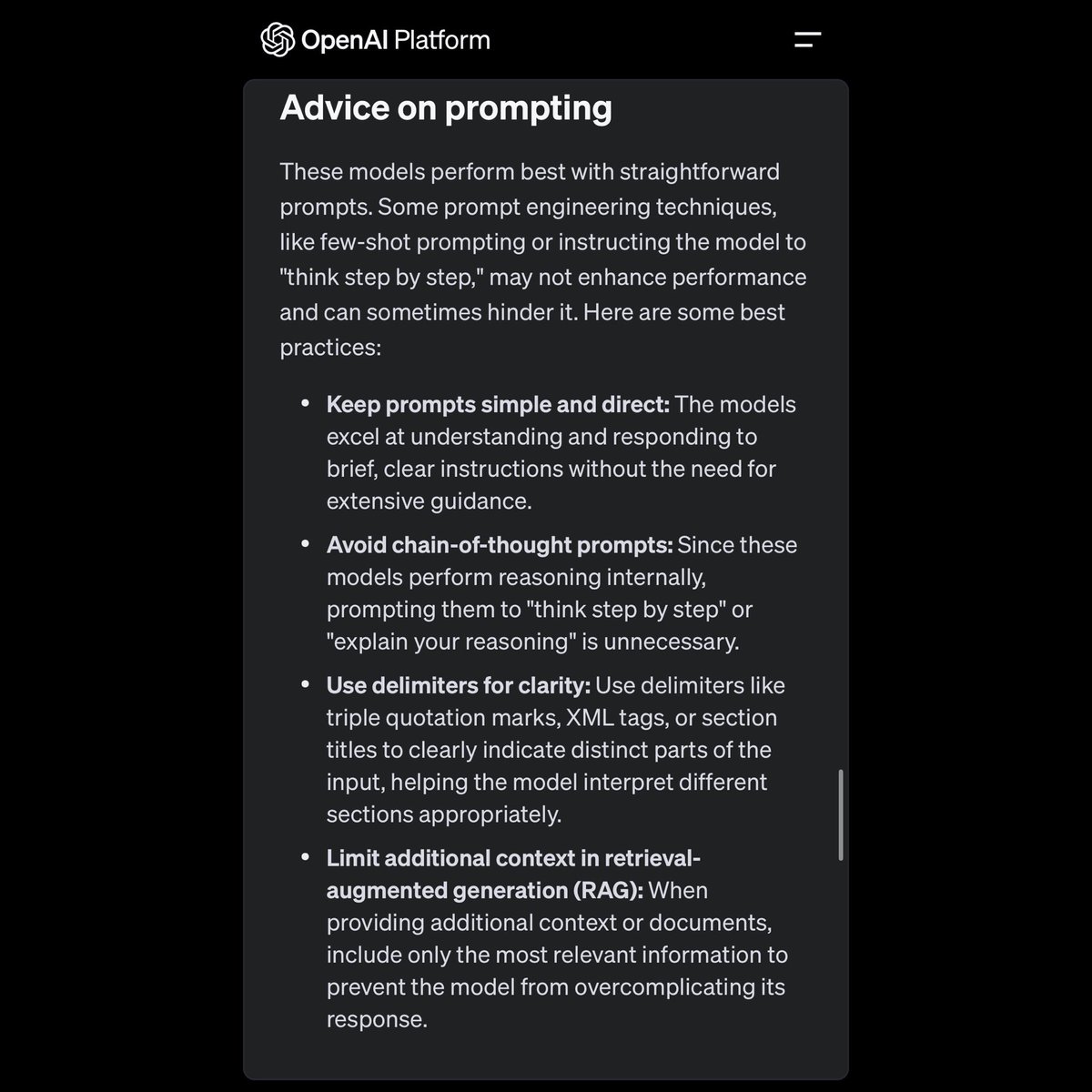- 新方式:由于o1模型内部已经具备强大的推理能力,你不需要再手把手教它怎么想。这些链式思维提示反而可能降低模型的性能。直接问问题,不必要求它“解释你的推理”。
