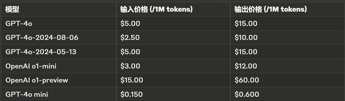 OpenAI o1-preview 的输入和输出成本最高,分别为 $15 和 $60,适合对处理质量要求极高且预算充足的用户。