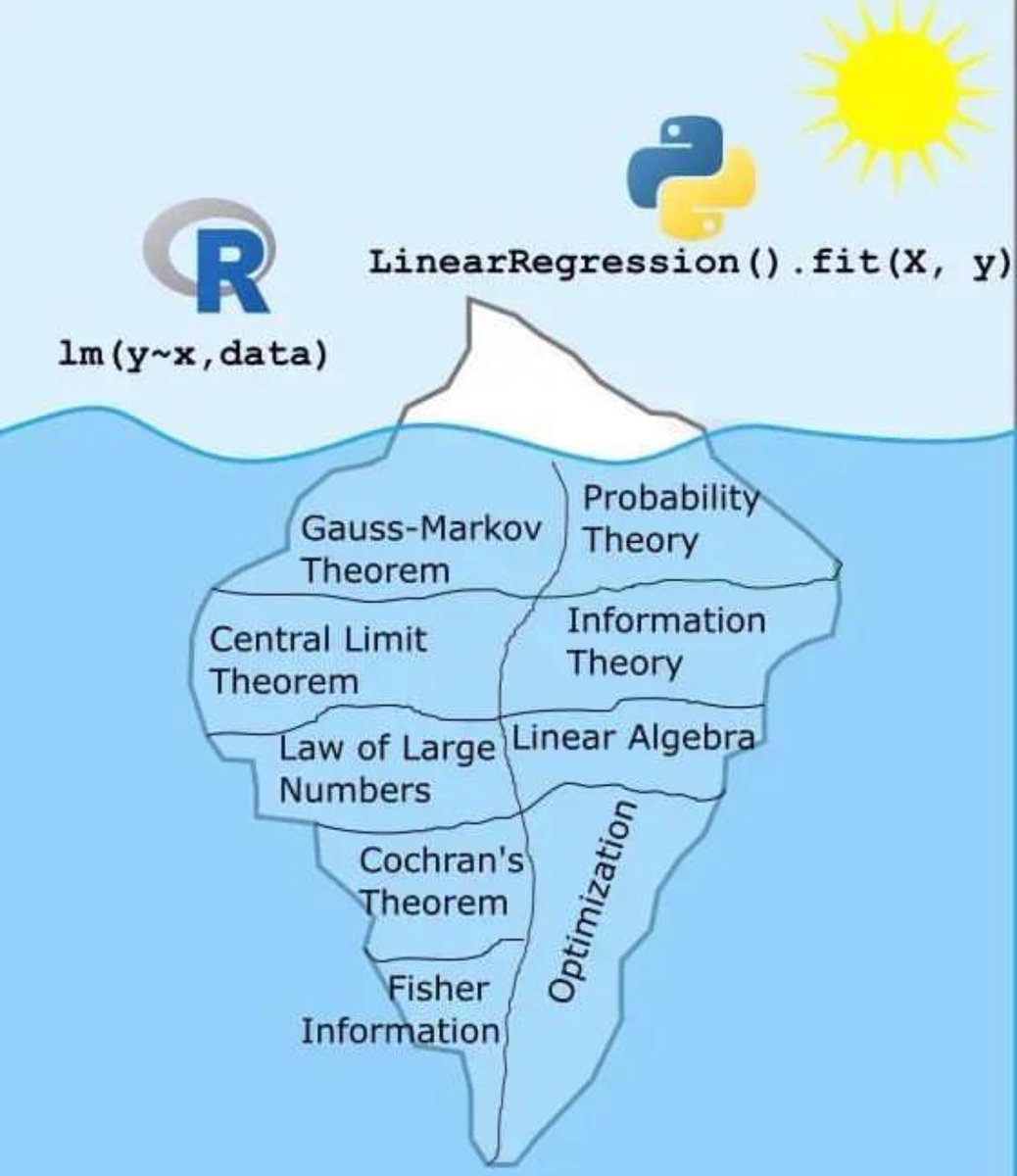 这张图用冰山的形象生动地展示了线性回归模型的表面操作与其背后复杂的数学和统计理论之间的关系。我们平时在R语言和Python中使用简单的一行代码来进行线性回归,但实际上,这一行代码背后有很多深奥的理论支持。
