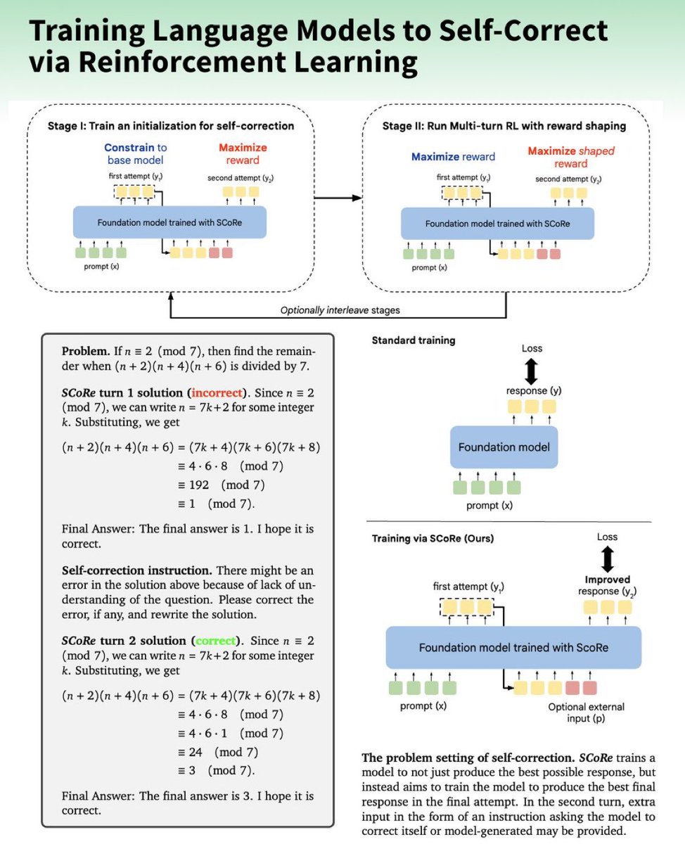 Google DeepMind开发了一种名为SCoRe的多轮思维链在线强化学习方法,旨在通过完全自生成数据来提升自我纠错能力。SCoRe在MATH和HumanEval两个基准上分别实现了15.6%和9.1%的性能提升。这项技术展示了在没有外部反馈的情况下,模型如何通过自我生成的数据进行训练,从而在推理问题上生成响应并纠正错误。