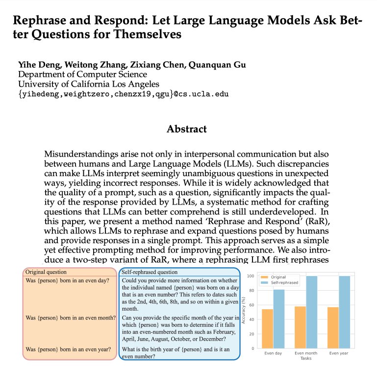 这篇论文介绍了一种名为“重述与回应”(Rephrase and Respond, RaR)的方法,该方法允许LLMs重新表述和扩展人类提出的问题,并在一个步骤内提供回答。这种方法不仅简单有效,而且能够显著提升AI的表现。论文还介绍了RaR的两步变体,其中一个LLM负责重述问题,另一个LLM提供最终回答。