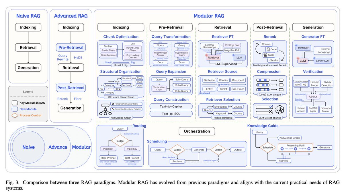 此外,Modular RAG还增加了路由(Routing)、调度(Scheduling)和知识指南(Knowledge Guide)等高级功能,以提高整体系统的灵活性和准确性。