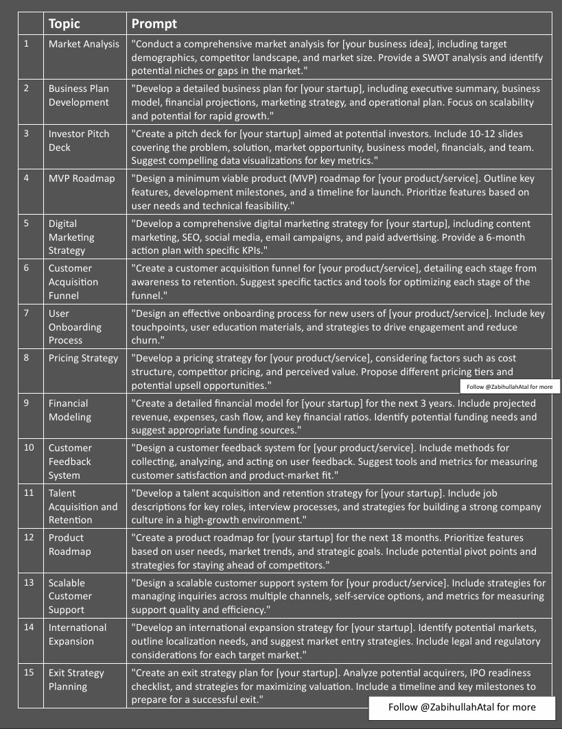 - "为[你的初创企业]制定详细的商业计划,包括执行摘要、商业模式、财务预测、营销策略和运营计划。关注可扩展性和快速增长潜力。"