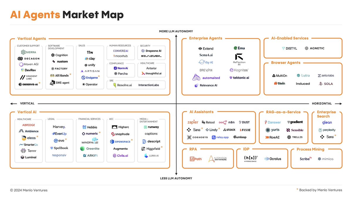 这张AI Agents市场图谱展示了当前AI Agents生态系统中的主要参与者,并将其分为不同的类别和层次,方便理解和分析。根据https://t.co/St5O59mmxt的分析,这张图谱可以从以下几个方面进行解读: