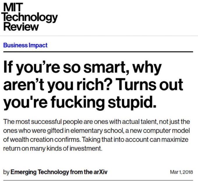 MIT Technology Review这篇文章标题的意思是,很多人可能觉得自己很聪明,但为什么却没有变得富有呢?结果可能是因为他们其实并不如自己想象的那么聪明。文章指出,真正成功的人不仅仅是那些在小学就被认为有天赋的人,而是那些拥有实际才能的人。新的计算模型表明,理解这一点可以帮助人们在各种投资中获得最大回报。
