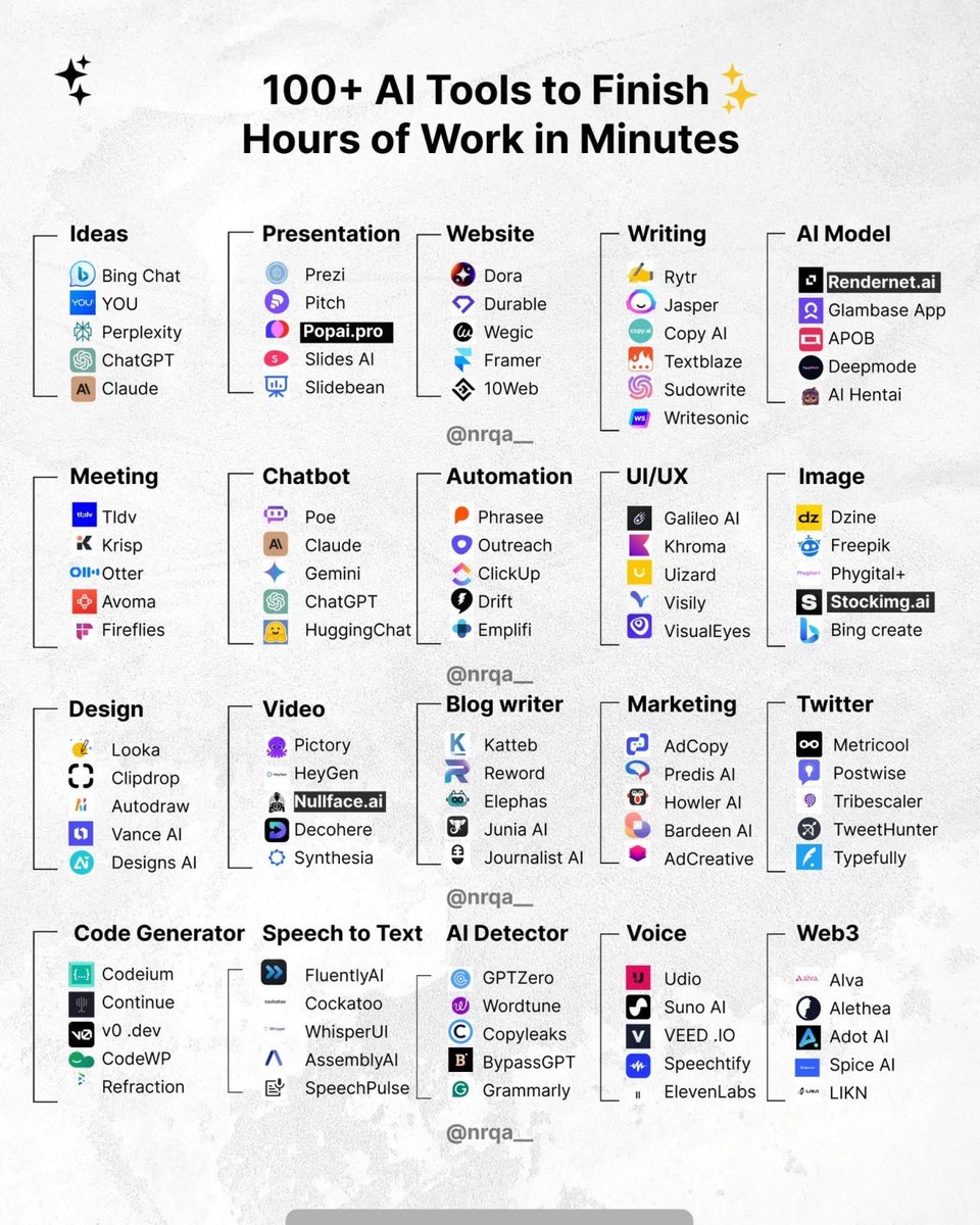据https://t.co/St5O59mmxt分析,这张图表详细列出了超过100种AI工具,涵盖从创意生成到自动化管理等多个领域,帮助用户以极高的效率完成各种任务。