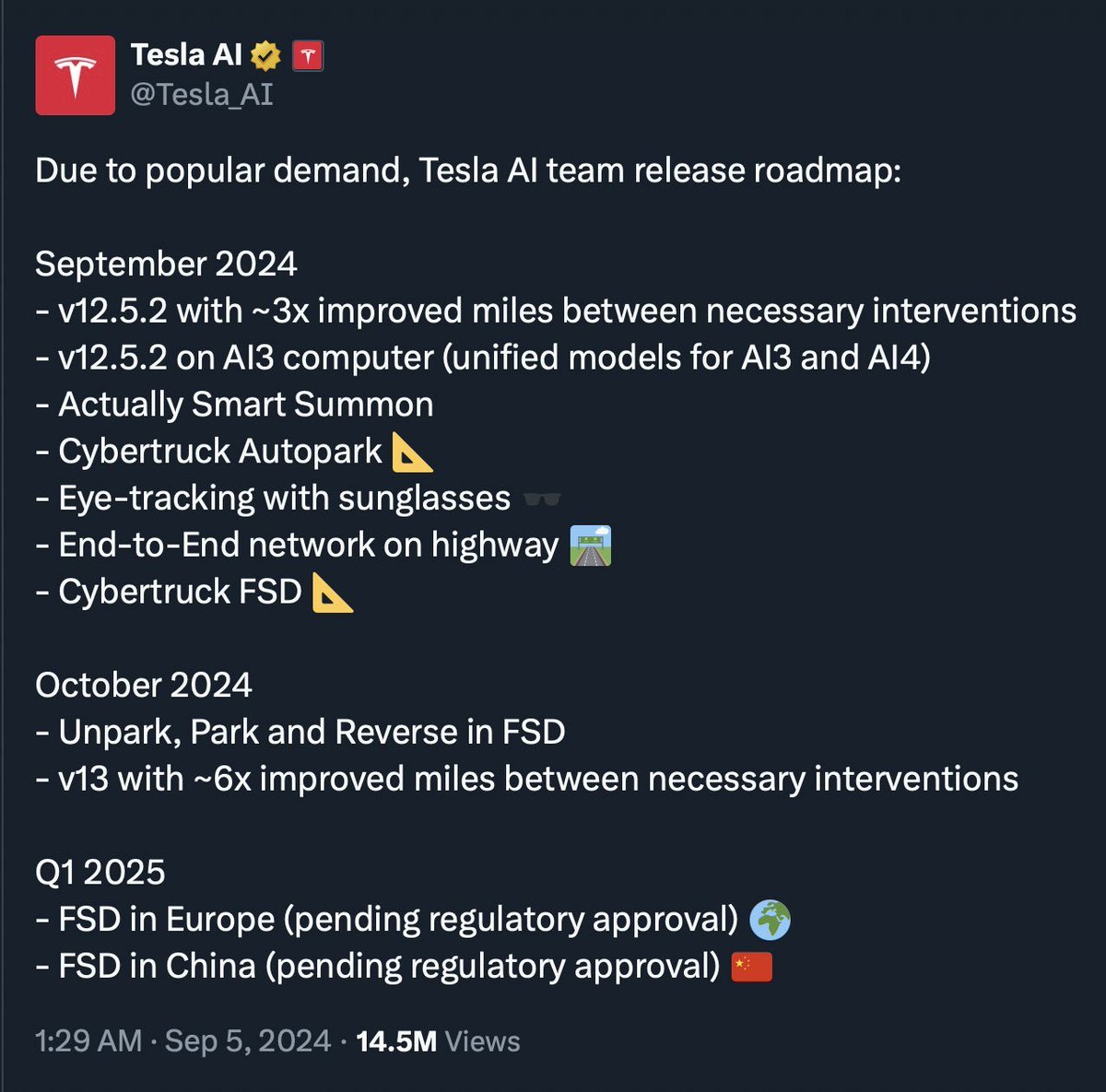 这份详细的路线图展示了特斯拉在自动驾驶技术上的巨大进步,不仅增强了现有功能,还推出了一些全新的突破。尤其是对Cybertruck的特别支持,以及在全球范围内推广FSD,这些都将进一步巩固特斯拉在自动驾驶领域的领先地位。