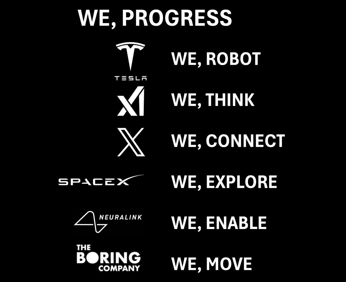 这张图片深刻揭示了Elon Musk的科技帝国如何通过不同的公司和技术进步,引领人类迈向未来。