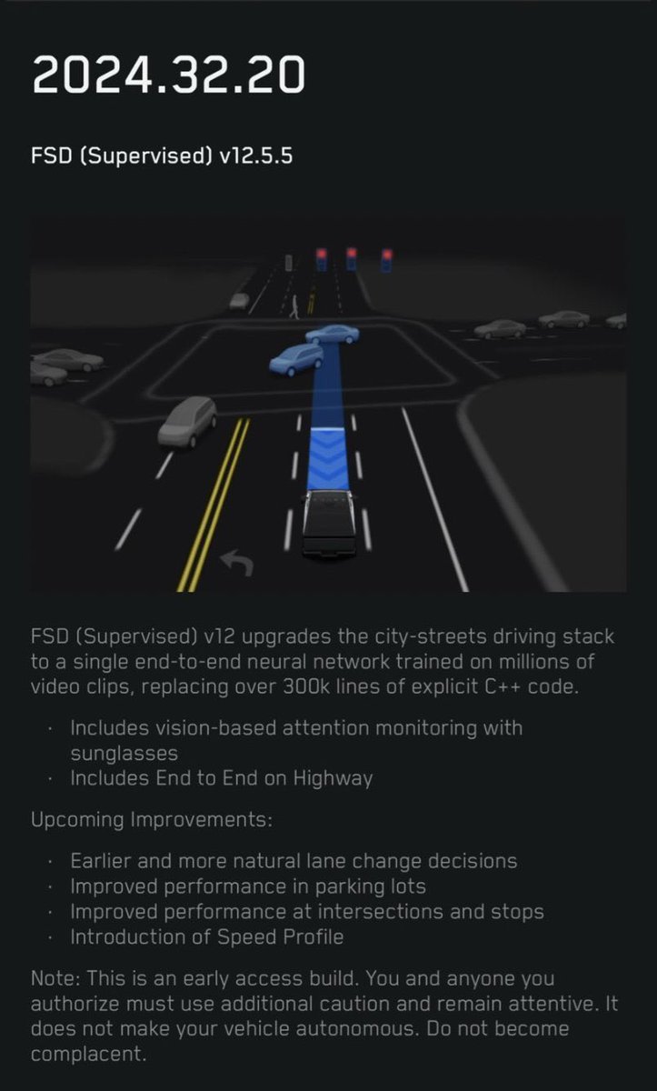 - 这是一个早期访问版本,用户需要保持高度警惕并额外注意,不要因为新功能而放松警惕。该版本并不意味着车辆已经完全实现自主驾驶,因此驾驶员仍需随时准备接管车辆控制。