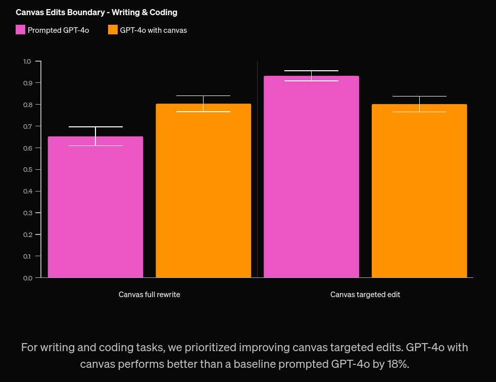 总结来说,结合canvas技术,GPT-4o的表现比基础Prompted GPT-4o提高了18%,特别是在目标编辑方面有显著改进。这意味着在写作和编程时,canvas能够有效提升AI的准确性和效率。