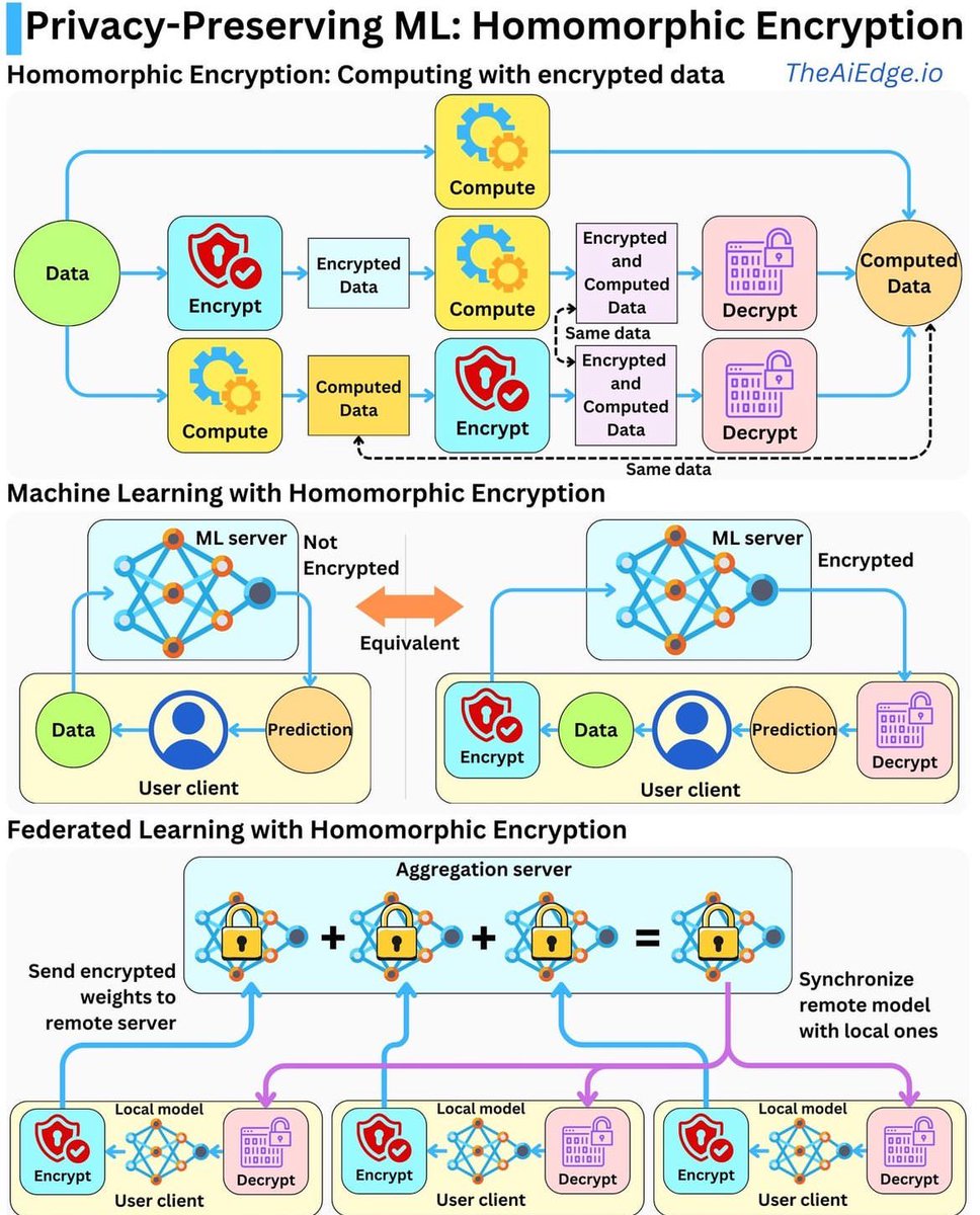 该图整体展示了如何在保护隐私的同时,利用同态加密技术实现安全高效的机器学习和联邦学习。