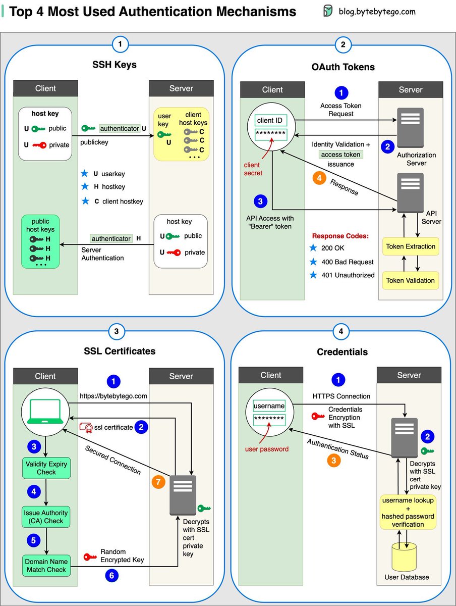 这张图展示了四种常用的身份验证机制,每种机制都有其独特的工作流程和安全特性。