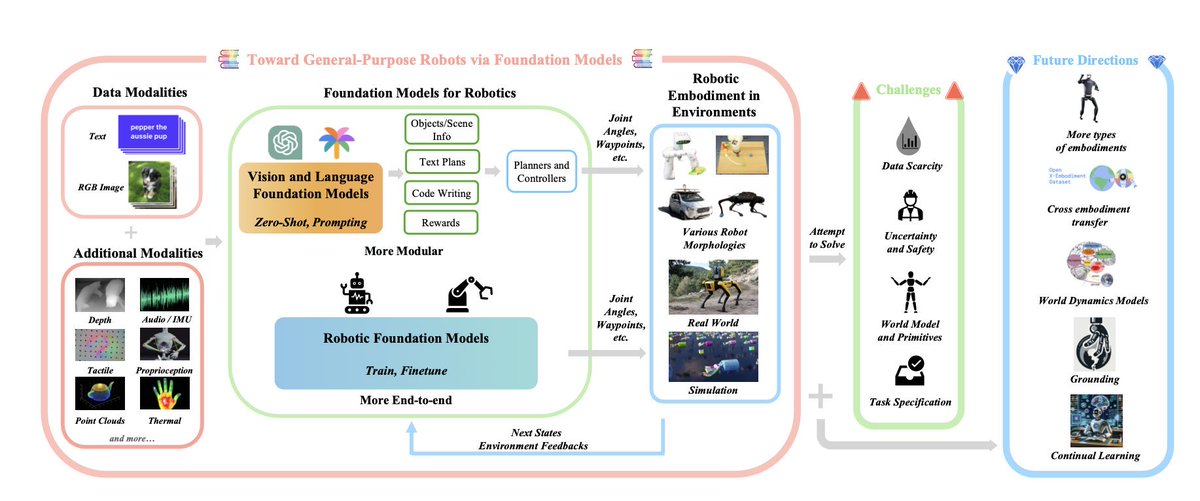 这张图展示了如何通过基础模型推动通用机器人的发展,涵盖从数据输入到未来方向的完整路径。