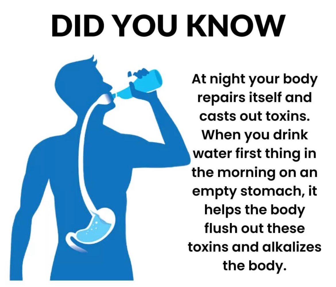 这张图解释了夜间身体自我修复和排毒的过程。早晨空腹喝水有助于冲刷体内毒素,并帮助维持体内酸碱平衡。通过这种简单的习惯,可以增强身体的自然代谢功能,促进健康。