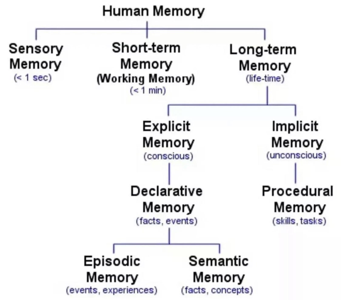 - 隐性记忆(无意识):程序性记忆,比如骑自行车或弹钢琴,不用刻意去想。