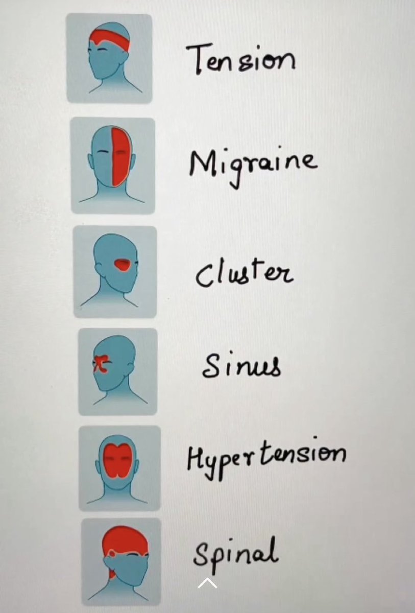 这张图展示了几种常见的头痛类型及其典型位置: